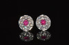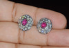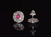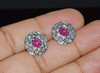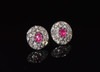 Top quality ruby and diamond domed disc earrings. These earrings feature a gorgeous elegant geometric design, centered with an oval brilliant-cut ruby and surrounded by round brilliant-cut diamonds set throughout the domed surface in a refined architectural pattern. These earrings are set with 0.74CTS of natural round brilliant-cut diamondsand 0.86CTS of natural oval brilliant-cut rubies. The beautiful eye-clean, near colorless diamonds are graded VS clarity, F–G color, and the natural rubies display a rich, vibrant red color. These are 100% natural rubies and diamonds. No artificial coloring, no glass filling, and no clarity enhancements. The high-quality natural diamonds and rubies are set into solid heavy 18K white gold.