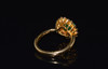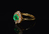 Certified natural 18K solid gold 1.96CTS diamond and emerald ring.This elegant ring is finely crafted in rich yellow gold and features a 1.20 carat pear-cut natural emerald surrounded by 16 marquise brilliant cut natural diamonds totaling 0.76 carats. The cluster arrangement creates a bold floral effect, sparkling with every movement.
