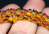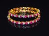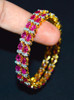 This bangle is set with many beautiful rubies. These are 100% natural, high quality rubies, with vibrant red color and a healthy internal pinkish red glow. The rubies have good clarity, but do have natural inclusions. The rubies are all very shimmery and sparkly and have a beautiful play of colors due to all the facets and excellent transparency. The rubies do display good internal neon red shine.