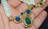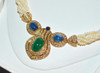 The center medallion is attached on both sides to eight strings of genuine seed pearls. The pearl strings can be worn loose or twisted in a rope like style. The pearls have a beautiful cream shade with golden hue. The pearls have a beautiful shine and good luster. This necklace closes in back with a sapphire and diamond studded clasp. This necklace has a hidden push and slide in clasp with safety clasp on both sides.