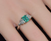 This ring features a stunning emerald-cut natural emerald weighing 1.23CTS, accented by four natural diamonds adding up to 0.85CTS. The center emerald displays a vivid bluish-green color with excellent transparency and a bright internal glow. It has clean, water-like clarity for an emerald, showing only minor natural inclusions under magnification.