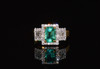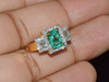 The emerald in this ring displays a vibrant green color with lively saturation and excellent internal brilliance. It shows natural inclusions consistent with earth-mined emeralds, visible upon close inspection and characteristic of genuine stones. The emerald has a bright, lively appearance with a beautiful play of light across its step-cut facets, giving it a shimmery and elegant presence on the finger.