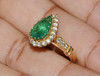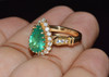 GIA certified 2.71CTS diamond and emerald solid 18K gold ring. This ring features a gorgeous GIA certified 2.12CT natural vivid green pear-cut emerald. The emerald is surrounded by round brilliant cut natural diamonds totaling 0.59CTS in a luxurious halo design, with additional diamonds extending down the shank in elegant pave settings. The ring is crafted in solid 18K yellow gold with fine milgrain detailing, showcasing exceptional craftsmanship and vintage-inspired charm.